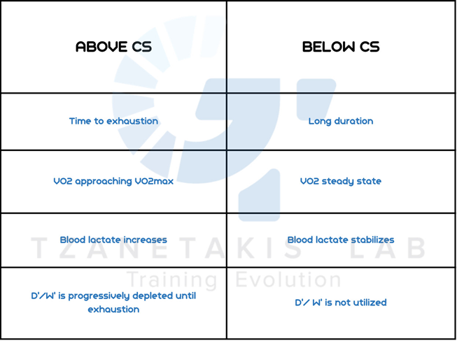 - Εξίσωση υπερβολικής σχέσης: t<sub>lim</sub> = D′ / (v – CS), όπου v η σταθερή ταχύτητα και t<sub>lim</sub> ο χρόνος μέχρι την εξάντληση. Η εξίσωση αυτή λέει απλά ότι όσο πιο πάνω από την CS βρίσκεται η ταχύτητα v, τόσο μικρότερο χρόνο (t_lim) μπορείτε να την αντέξετε – και μάλιστα υπολογίσιμο χρόνο, αφού το γινόμενο (v – CS) × t_lim είναι σταθερό και ίσο με D′.