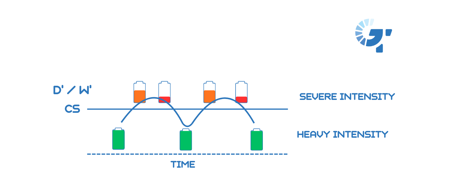 Όταν η ένταση βρίσκεται πάνω από την Κρίσιμη Ταχύτητα (CS), το απόθεμα D′/W′ «αδειάζει». Όταν η ένταση πέφτει κάτω από την CS, το D′/W′ «ξαναγεμίζει». Αυτό το μοντέλο εξηγεί γιατί η διαλειμματική προπόνηση μπορεί να παρατείνει τον συνολικό χρόνο εργασίας πάνω από την CS κάθε φάση αποκατάστασης επιτρέπει μερική αναπλήρωση του περιορισμένου αποθέματος.